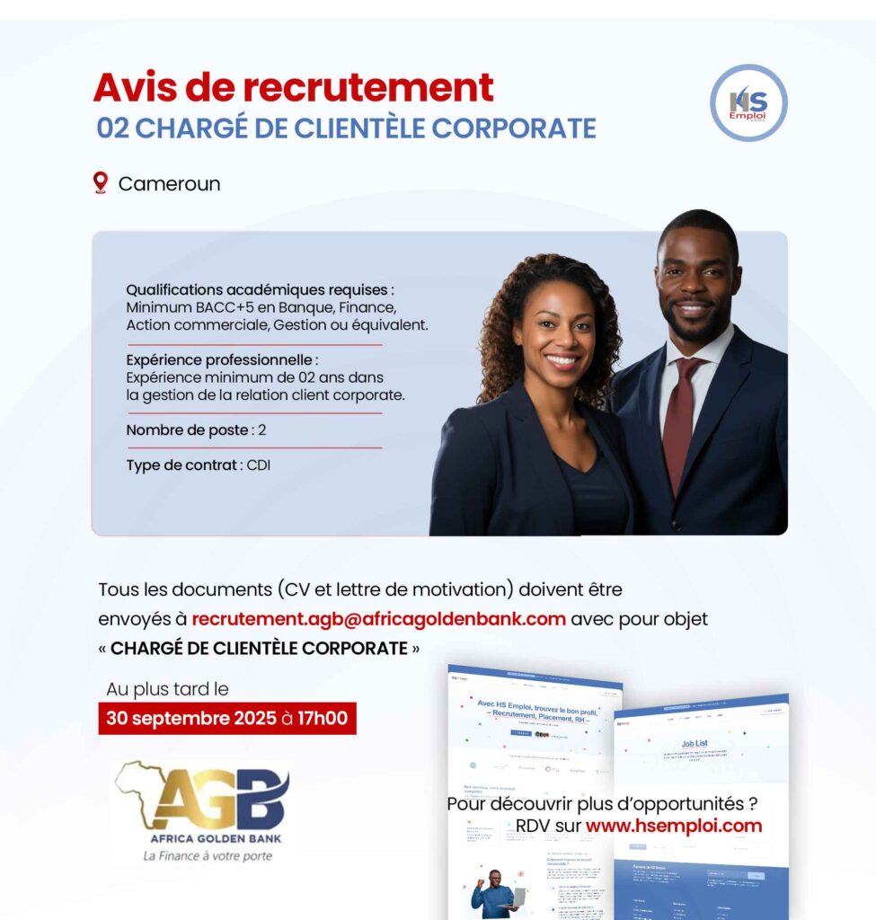 Tous les documents (CV et lettre de motivation) doivent être envoyés à recrutement.agb@africagoldenbank.com avec pour objet « CHARGÉ DE CLIENTÈLE CORPORATE »